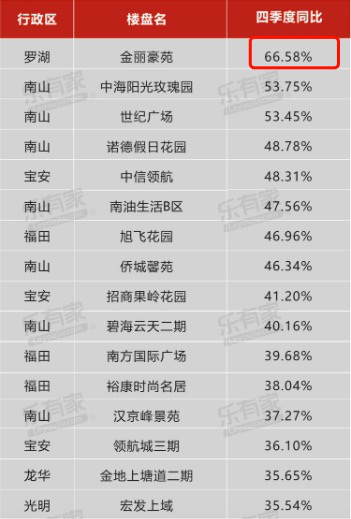 此前,乐有家统计了50个深圳关注度较高楼盘2020年四季度成交价格的同比涨幅。其中,罗湖的金丽豪苑涨幅高达66.58%,南山的中海阳光玫瑰园与世纪广场涨幅也超过了50%,前十名涨幅均超40%。