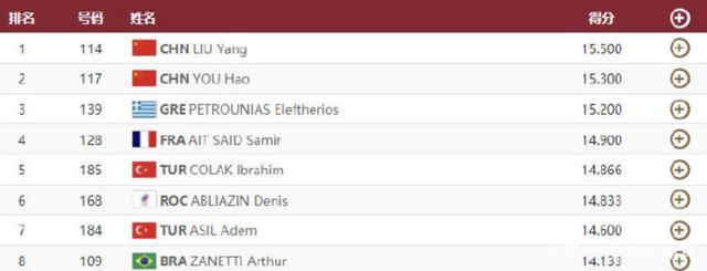 最后希腊选手出场了,希腊选手是预赛的第一名,但是希腊选手落地没有站住,跳了一下。最终希腊选手是15.200,没能超过尤浩和刘洋。