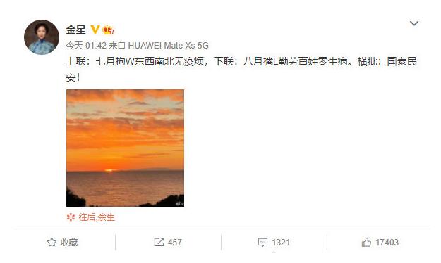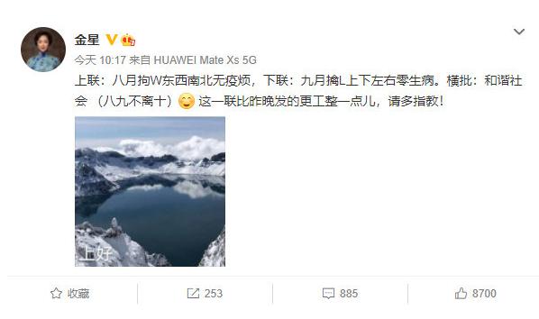 8月2日凌晨,金星发文评价了吴亦凡事件,上午又再次发文,“上联:八月拘W东西南北无疫烦,下联:九月擒L上下左右零生病。横批:和谐社会 (八九不离十) 这一联比昨晚发得更工整一点儿,请多指教! ” 姐姐真有才!!