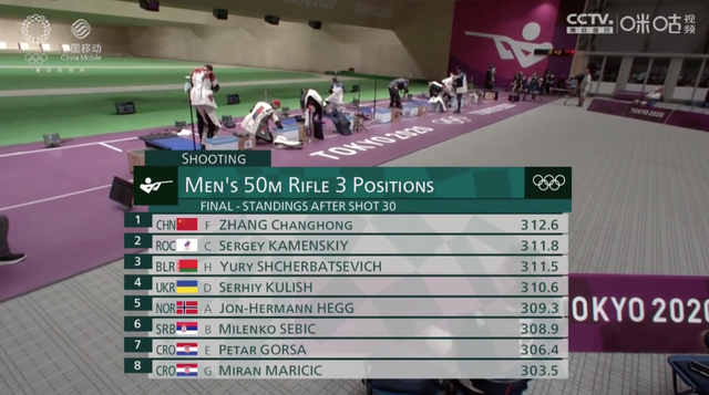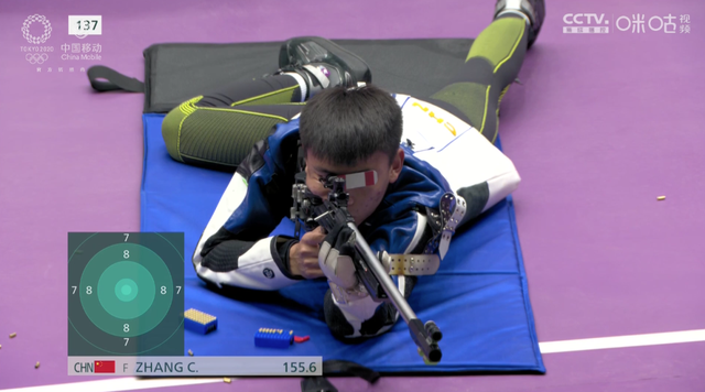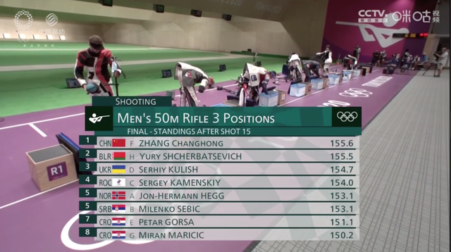 三轮跪姿射击后,张常鸿以155.6分暂列第一