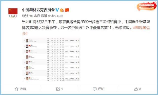 【摘要】 中工网讯 据中国奥林匹克委员会官微消息,当地时间8月2日下午,东京奥运会男子50米步枪三姿资格赛中,中国选手张常鸿排名第2进入决赛争夺