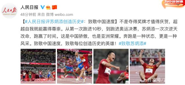 “苏炳添的身体条件一般,但比赛中不被对手的节奏打乱,一切都按照自己的步伐节奏进行。而且,苏炳添32岁了,结婚生子,但是非常自律,对自己的训练非常严格。正所谓自律者出众,苏炳添,好样的,他打进了奥运会百米飞人八强,成为中国第一飞人,载入史册。”