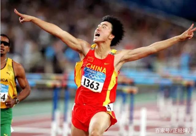 到2004年雅典奥运会上,刘翔率先冲过终点线的瞬间。