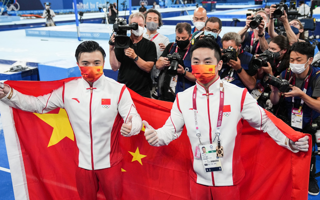 在资格赛中,刘洋分数是15.3分,排名第二,尤浩成绩是14.8分排名第八。决赛中,尤浩率先出场,动作一气呵成,难度分为6.6分,完成分为8.7分,最终拿到15.3分,排名第二。而刘洋第三个出场,难度分6.5分,完成分高达9分,最终以15.5分排名第一!这也是中国体操队在东京奥运会上的第一枚金牌!在站上领奖台前,刘洋和尤浩两人联合撑起中国国旗一幕,让人无比感动!