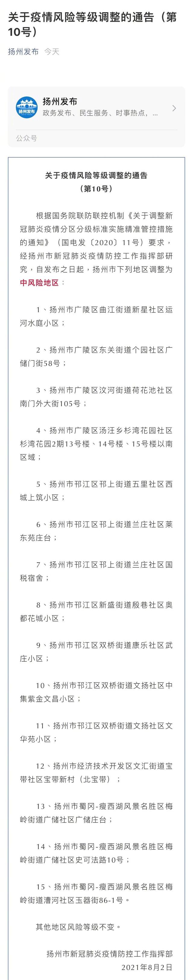 扬州市卫健委副主任王劲松通报,截至目前,扬州市共有高风险地区1个,中风险地区14个。通过对病例流行病学调查,扬州市已排查出密切接触者和次密接2711人,均已按照有关规定进行甄别管理。