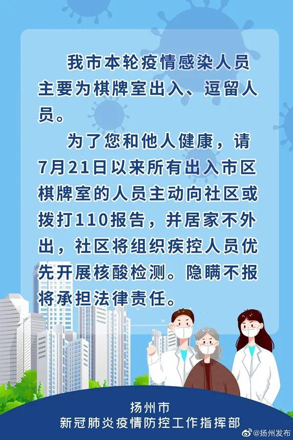 据@扬州发布 :扬州本轮疫情感染人员主要为棋牌室出入、逗留人员。请7月21日以来所有出入市区棋牌室的人员主动向社区或拨打110报告,并居家不外出,社区将组织疾控人员优先开展核酸检测。隐瞒不报将承担法律责任。