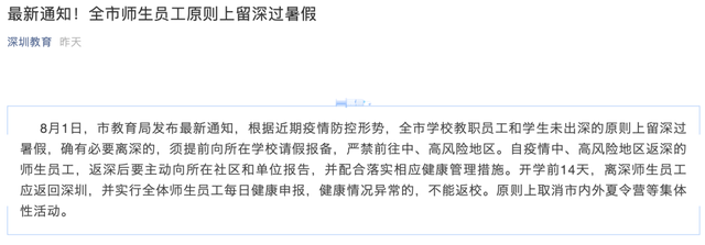 8月1日,据深圳市教育局消息,广东深圳学校教职员工和学生未出深的原则上留深过暑假,确有必要离深的,须提前向所在学校请假报备,严禁前往中、高风险地区。