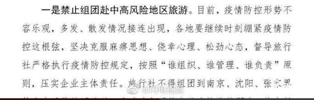 “通知”要求山东各旅行社严格执行疫情防控规定,禁止组团赴南京、沈阳、张家界等中高风险地区旅游,从严做好游客招徕、组织、接待等环节的疫情防控工作。