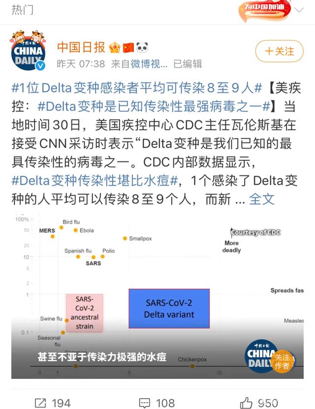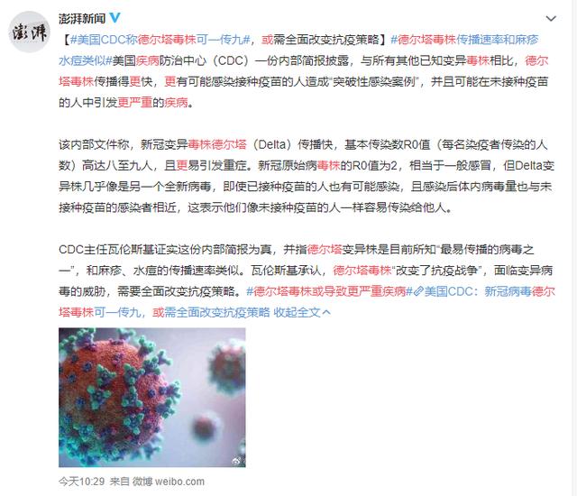 对于德尔塔病毒,我们并不陌生,而据《华盛顿邮报》、美国有线电视新闻网29号消息,美疾控中心的一份内部文件所引用的近期疫情调查与外部研究数据表明,正在美国肆虐的新冠变异病毒#德尔塔传染性不亚于水痘#,可以通过接种疫苗的人传播,并可能导致比早期毒株更严重的疾病。美疾控中心承认了这份文件的真实性。美疾控中心主任表示,人们应该认识到问题的严重性。