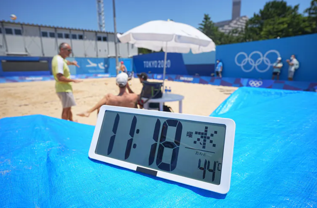 东京一个沙滩排球练习场上的温度计显示上午 11 点是 44 摄氏度。
