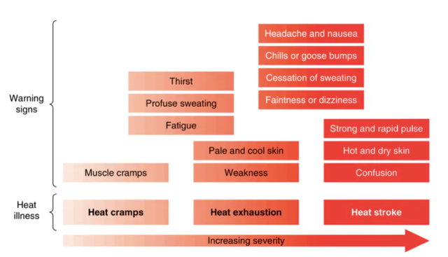 更严重的是,高空气温度、高湿度以及高太阳能和辐射热负荷(直接来自太阳和加热的周围表面的辐射热)的组合会产生过度的热应力。因此,您的核心温度(通常为 37°C)会不受控制地升高。正如研究所强调的那样,根据国际准则,这种情况应该会导致活动被取消。允许他们继续前进会使运动员面临中暑的高风险。这些范围从痉挛和昏厥到精疲力竭和中暑,这是一种具有长期多器官后果的严重疾病(见下图)。