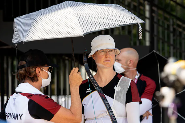 德国射手丽莎·安鲁(Lisa Unruh)用遮阳伞避暑。