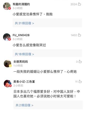 福原爱沉默多天,近来终于露面为刘诗雯福暖心打气,此举也再次让她在微博翻红,陆网友纷纷大讚她「爱酱还是那麽可爱,这种感情真的难得」、「神仙友谊」、「唯一喜欢的日本人」,不过也有网友发现她在影片中看来不如以往亮眼,留言写道「一段失败的婚姻让小爱那麽憔悴了,心疼她」、「岁月在小爱脸上留了些痕迹」、「感觉爱酱憔悴了许多啊」。