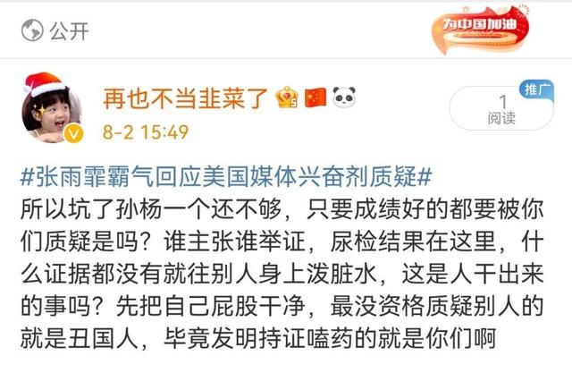 【摘要】 今天,美国媒体在赛后采访中向中国游泳队提问,质疑中国队使用兴奋剂。张雨霏淡定回应:中国选手是全世界接受尿检最多的!霉国的常规操作了