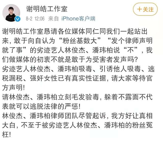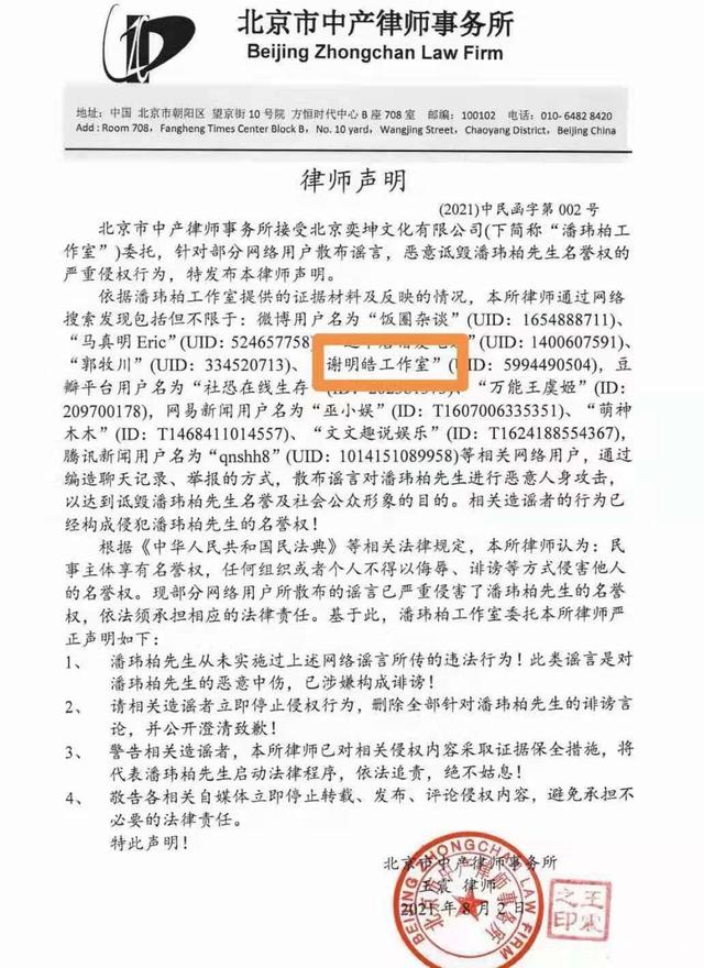 此后没多久,潘玮柏一方发律师声明,提到了很多恶意侵犯自己名誉权的账号,并对其进行追责,其中便包括“谢明皓工作室”。