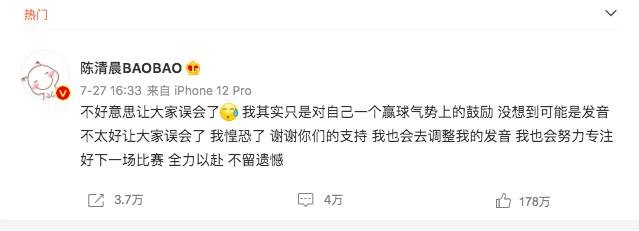 赛后,陈清晨发布微博称:“不好意思让大家误会了,我其实只是对自己一个赢球气势上的鼓励 ,没想到可能是发音不太好让大家误会了,我惶恐了,谢谢你们的支持,我也会去调整我的发音,我也会努力专注好下一场比赛,全力以赴,不留遗憾。”
