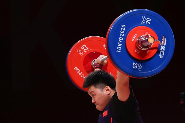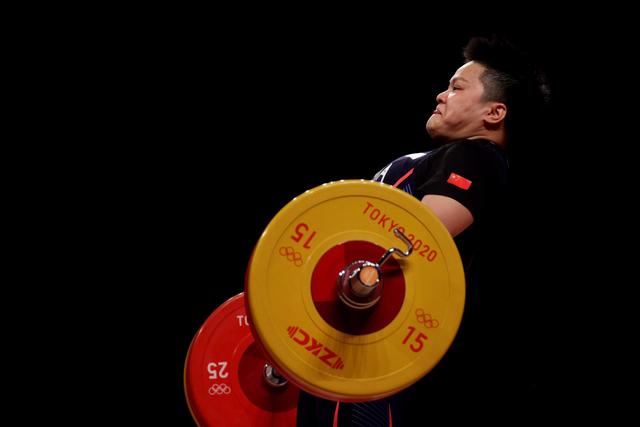 当地时间2021年8月2日,日本东京,2020东京奥运会举重女子87公斤级决赛。比赛中的汪周雨。因国际举联调整举重级别,为了备战东京奥运会,为了自己多年的奥运梦想,汪周雨决心增重20斤,从76公斤级升到了87公斤级。汪周雨升级后的首战是2019年4月举行的亚锦赛暨奥运资格赛,她就以280公斤战绩夺冠。