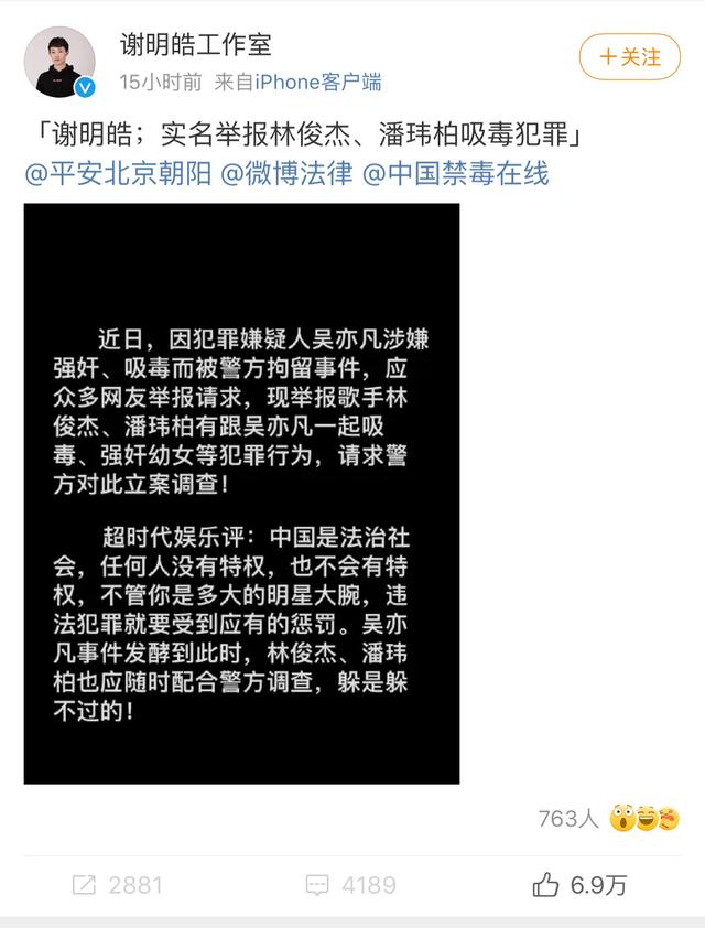 然而在8月2日,艺人谢明皓工作室做了一个大胆的想法,那就是举报他们二人“涉毒”,希望对他们带到警局“验毒”,如果两人都没这种行为,自己愿意承担法律责任,谢明皓的举动让大家感到十分惊讶,感觉又有瓜吃了