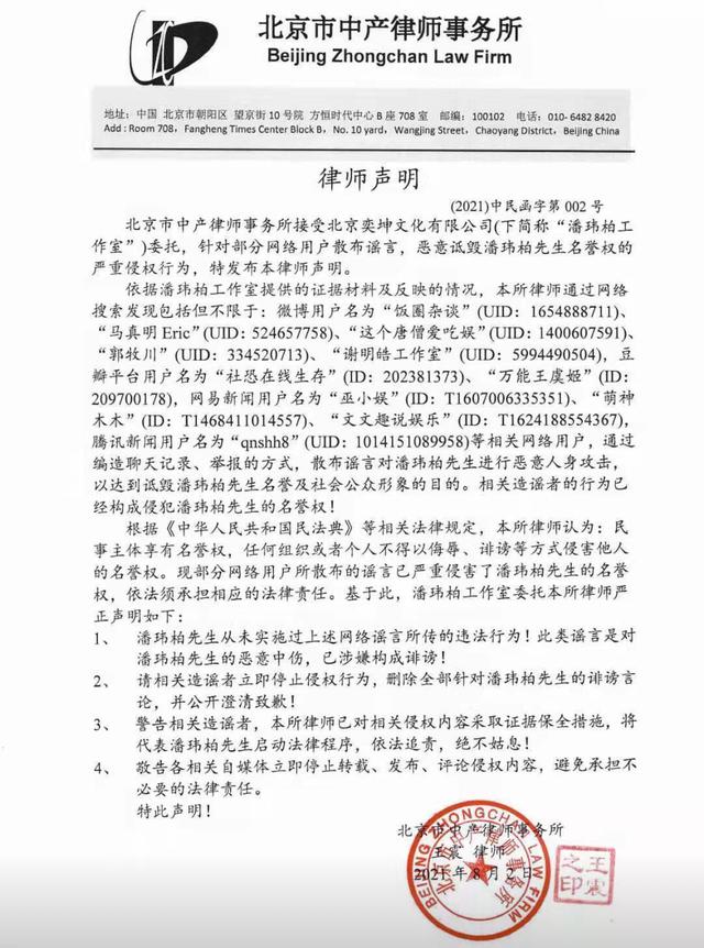 除此之外,潘玮柏也发出了律师声明,表示谢明皓这个造谣者在散播谣言,发布各种不实信息,对潘玮柏的名誉造成严重污染,还要求对方适可而止!对于谢明皓发布的夸张谣言内容,潘玮柏将会追责到底,同时也会使用法律手段维权