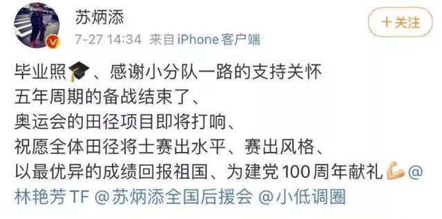 毕业后他并没有停下脚步,反而继续攻读博士学位,今年7月27日,苏炳添在微博发文表示自己已经顺利博士毕业。