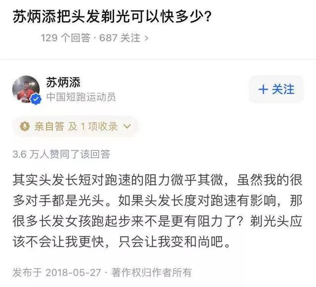 很有意思的是苏炳添在闲暇之余会在一些问答平台回答一些与自己相关的问题。