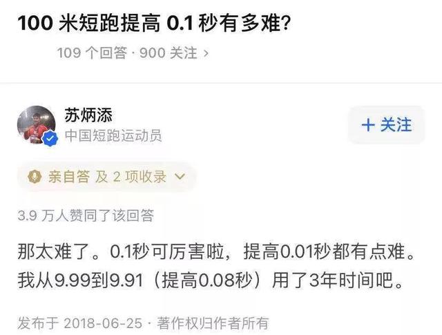 很多人并没有想到自己提的问题竟然能够吸引苏炳添本尊的回复,而且他自身的亲身经历更有说服力,也让大家更加真切地感受到100米想要提升成绩真的很难,哪怕只提升0.01秒。