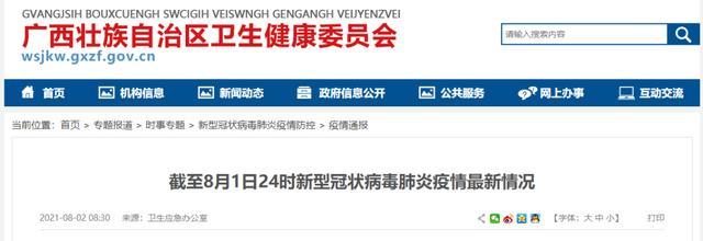 8月1日0至24时,广西无新增本土确诊病例、疑似病例和无症状感染者。今日新增密切接触者10人。现有境外输入确诊病例2例,现有境外输入无症状感染者5例,现有密切接触者76人。