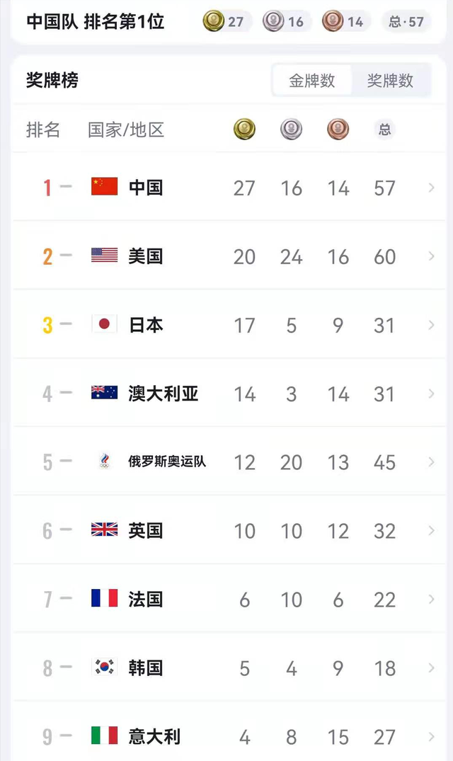 目前中国奥运会代表团以27金16银14铜排名金牌榜榜首,同时领先美国体育代表团高达7金,同时日本体育代表团在柔道项目结束之后,金牌榜出现了停滞,期待中国奥运军团在接下来的赛事中能够有着更加出色的表现。