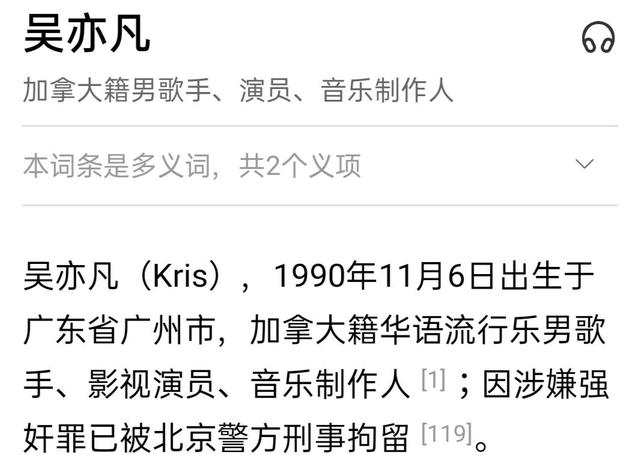 百度百科中对吴亦凡的介绍不知什么时候就多了这么一句话:因涉嫌QJ罪已被北京警方刑事拘留。更有意思的是维基百科更改了吴亦凡的居住地为:北京朝阳区朝阳北路29号(朝阳区看守所)。