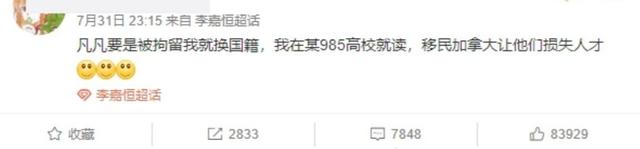 值得一提的是,在曝出吴亦凡被刑拘的消息后,有一名脑残女粉丝发布微博称,要是吴亦凡被拘留她就换国籍,还说自己在985高校就读,移民加拿大让国家损失人才。紧接着她又发一条微博称自己准备想办法看能不能救出吴亦凡,实在不行的话就移民了。