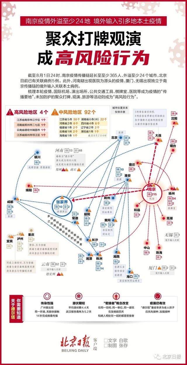 截至8月1日24时,南京疫情传播链延长至至少365人、外溢至少24个城市,北京目前已有关联病例5例。此外,河南疑出现医院为源头的疫情,厦门、无锡出现独立于南京传播链的境外输入关联本土病例。