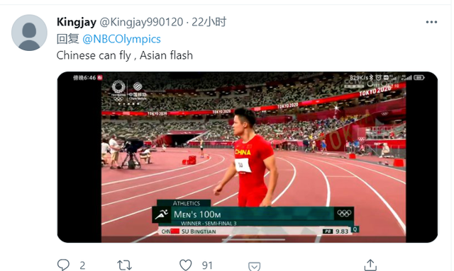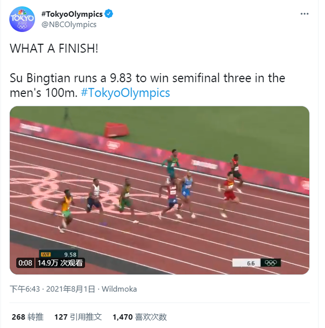 美国全国广播公司(NBC)在其社交媒体上称赞道,多么精彩!中国选手苏炳添在男子100米半决赛第三小组中以9秒83进入决赛!