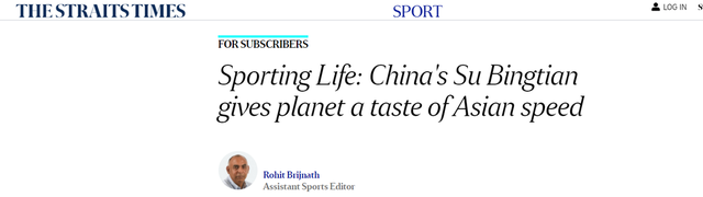 新加坡《海峡时报》报道直呼,苏炳添真是太酷了!他让世界感受到了亚洲速度。