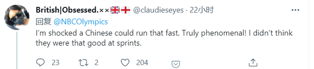 英国网友说:“我很惊讶一个中国人能跑那么快。真了不起!我还不知道他们也擅长短跑。”
