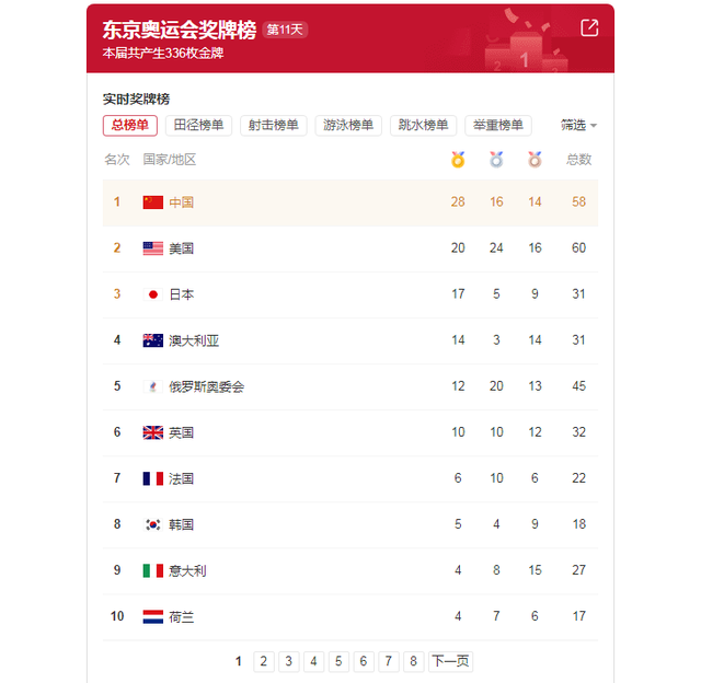 在下午16点27之时,汪周雨在女子举重87公斤的比赛中,成功夺得金牌,在此后的4分钟,也就是16点31分,男子体操吊环的决赛中,中国选手刘洋和尤浩提前包揽了这项比赛的金银牌,11分钟之后,也就是16点42分,男子50米步枪三姿中,中国队00后小将发挥出色,打破世界纪录成功成功拿下这块金牌。在17点15分,中国组合钟天使/鲍珊菊在场地自行车女子团体中成功卫冕。这四金一银是在短短的45分钟之内完成,让中国代表团的金牌数来到28枚。银牌16枚,铜牌14枚,远远高于美国的金牌20枚和日本的17枚金牌,中国代表团展示出来的速度令人振奋,值得一提的的,目前中国队28枚金牌已经超过上一届里约奥运会26枚金牌总数。