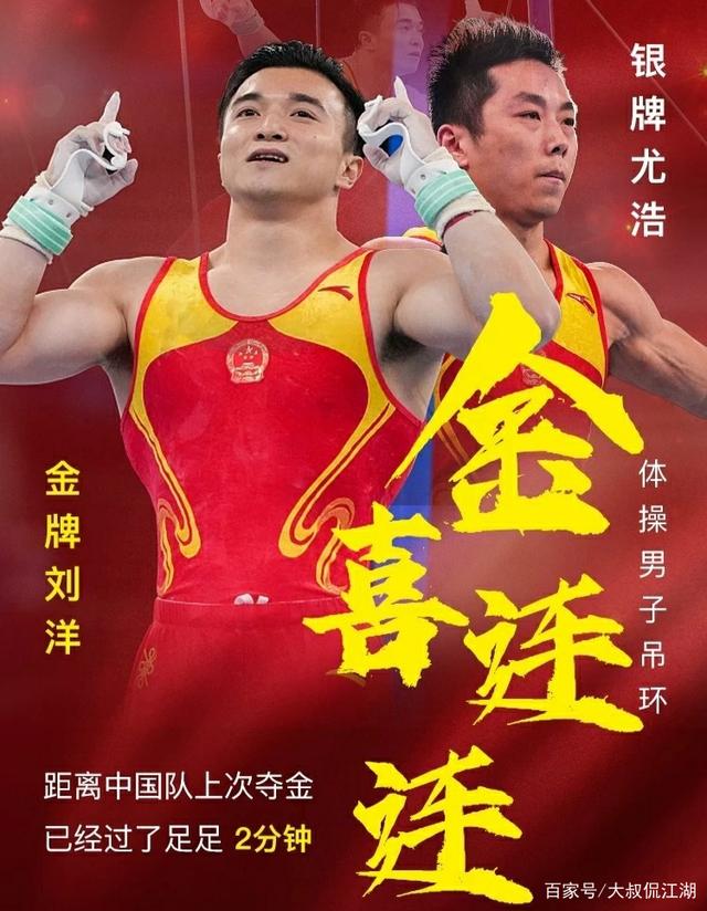 仅仅两分钟过后,中国队再传捷报,竞技体操男子吊环决赛上,刘洋、尤浩完美发挥,一扫体操队前几日的阴霾,包揽了冠亚军,为中国军团再添一金一银。