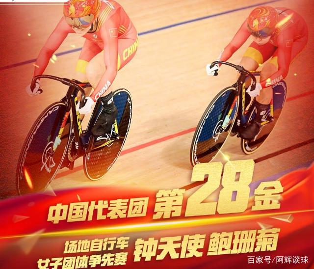 就在大家都为前三块金牌高兴时,中国队的第28金立刻赶来,在东京奥运会场地自行车女子团体争先赛,由钟天使和鲍珊菊组成的中国队战胜了强大的德国队夺得金牌,里约奥运会上,钟天使和宫金杰头戴穆桂英、花木兰京剧脸谱头盔夺得中国女子第一枚自行车金牌。五年后,钟天使头戴凤凰头盔再度夺金。