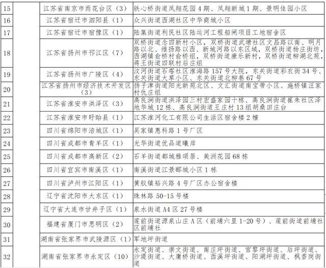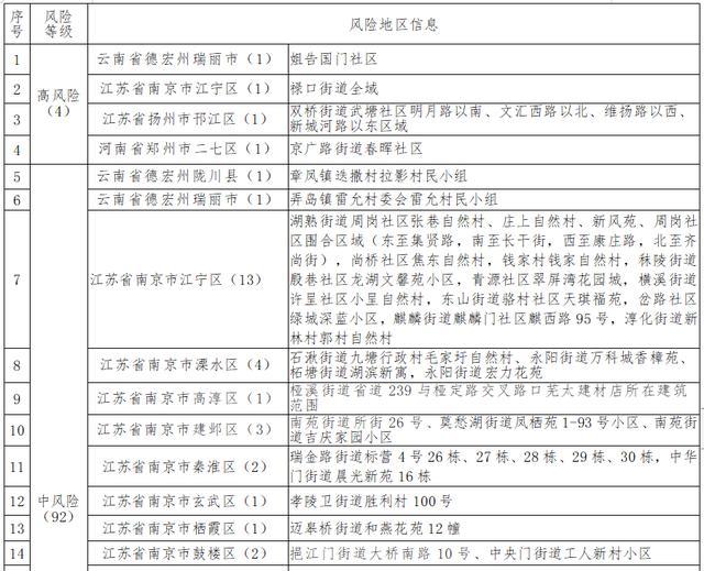 自8月1日起,对江苏省扬州市部分区域疫情风险等级进行调整:扬州市邗江区双桥街道武塘社区明月路以南、文汇西路以北、维扬路以西、新城河路以东区域由中风险地区调整为高风险地区;下列地区调整为中风险地区:扬州市广陵区东关街道大草小区;扬州市广陵区东关街道北柳巷67号;扬州市邗江区双桥街道康乐新村;扬州市邗江区双桥街道柳湖北苑;扬州市邗江区蒋王街道四联村后庄组;扬州市经济技术开发区扬子津街道阳光新苑北区;扬州市经济技术开发区文汇街道南宝带小区;扬州市经济技术开发区施桥镇汪家村仇庄组。其他地区风险等级不变。
