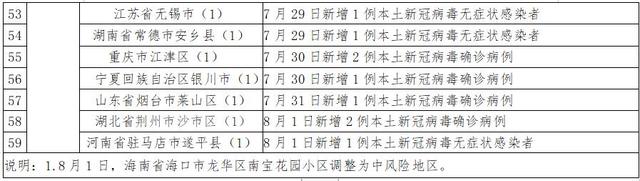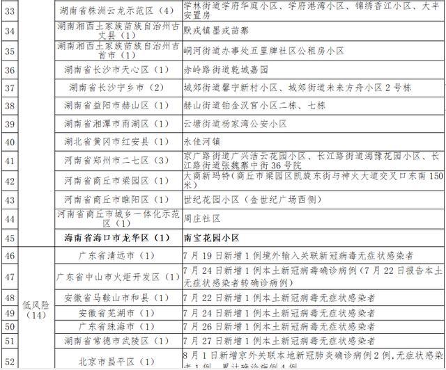 8月1日,海南省海口市龙华区南宝花园小区调整为中风险地区。其他地区风险等级不变。