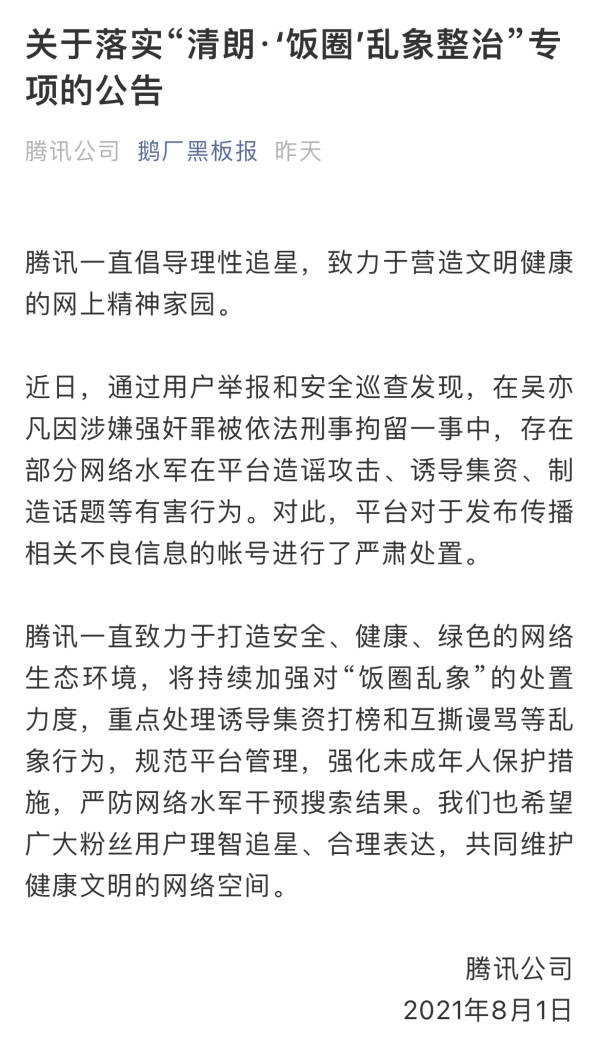 《公告》表示,腾讯将持续加强对“饭圈乱象”的处置力度,重点处理诱导集资打榜和互撕谩骂等乱象行为,规范平台管理,强化未成年人保护措施,严防网络水军干预搜索结果。希望广大粉丝用户理智追星、合理表达,共同维护健康文明的网络空间。