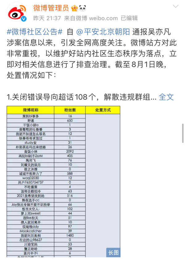 此前,@微博管理员 微博发布公告称,自@平安北京朝阳 通报吴亦凡涉案信息以来,引发全网高度关注。微博站方对此非常重视,以维护好站内社区生态秩序为落点,立即对相关信息进行了排查治理。截至8月1日晚,处置情况如下: