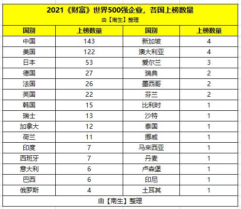 以营收为标准,按国别划分,2021版本的《世界500强企业榜单》中,咱们中国再次排名第一,上榜了143家企业(包括台湾地区的8家企业)。其中,新上榜和重新上榜的中国公司有18家,包括:中国船舶集团、敬业集团、新希望控股集团、潍柴动力、龙湖集团、华润置地等。