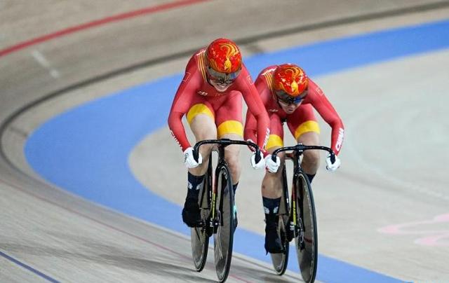 又过了半个小时,场地自行车馆捷报来了。场地自行车女子团体争先赛金牌赛,中国组合钟天使/鲍珊菊在资格赛中打破世界纪录,金牌赛中对战德国组合。最终,中国组合钟天使/鲍珊菊骑出31.895秒的成绩夺得金牌!