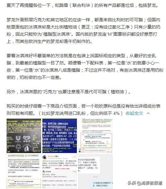 微博博主“游戏打折情报”在博文中提及梦龙国内版里包的冰淇淋是大比例植物油和少量奶粉,而其在欧洲生产的梦龙却是牛奶制作的。