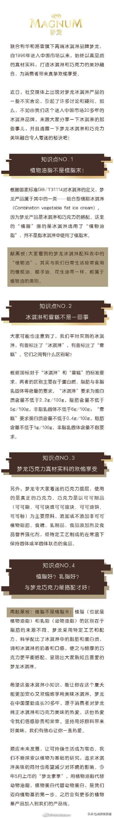 网传消息显示,梦龙官微曾于8月1日发表长图回应称,“根据国家标准GB/T31114对冰淇淋的定义,梦龙产品属于其中的一类的组合型植脂冰淇淋,因为梦龙产品是冰淇淋和巧克力的搭配。这里的“植脂”指的是冰淇淋选用了“植物油脂”,并不是指冰淇淋中使用了植脂末。”但这一说法被认为是梦龙MAGNUM承认了国内版冰淇淋用了植物油,而不是牛奶。随后,此回应被删除。