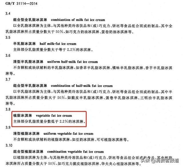 而根据乳脂含量,冰淇淋可以分为全乳脂、半乳脂、植脂等。在GB/T 31114-2014中,植脂冰淇淋的定义为“主体部分乳脂质量分数低于2.2%的冰淇淋”,并未提及植脂末。