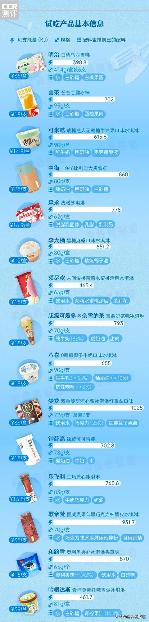 其他参与测试的冰淇淋、雪糕产品的成分配料表前三名如下,仅供大家作消费参考。