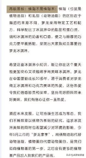 另外,梦龙已经删除的回应长图也显示,梦龙旗下产品确实采用了植物油脂。并表示今年5月上市的“梦龙素享”,用植物油脂代替动物油脂,植物蛋白代替动物蛋白。