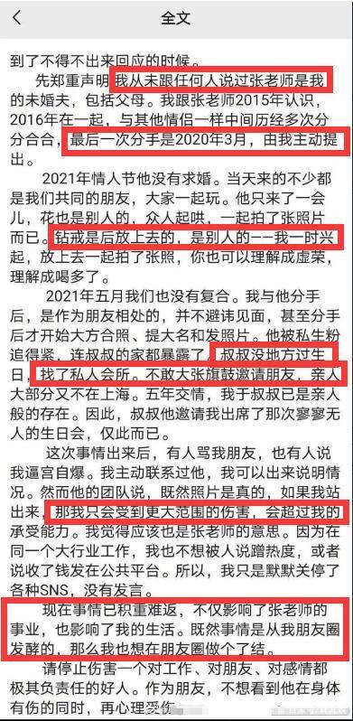 王佩雯开篇就直接否认和张哲瀚的关系,并且把两人从2015年认识到2020年3月分手都大致罗列了出来。随后用2大段文字回应了曝光的照片的由来,确实很巧合:2021年情人节的钻戒,是在众人起哄后放上去一起拍照的;2021年5月份张哲瀚的私生粉曝光他家庭地址,导致张哲瀚的爸爸生日都没有办法大张旗鼓地办,最后张哲瀚的爸爸邀请她去参加生日会,现场人很少。王佩雯也曝光了这一次发布朋友圈进行澄清的原因:自己的工作和张哲瀚的事业受到了影响,想要做个了结。