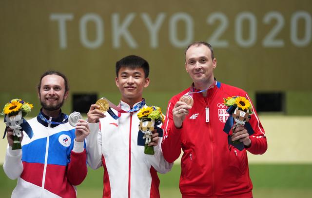 新华社照片,东京,2021年8月2日 (东京奥运会)(12)射击——男子50米步枪三姿决赛:中国选手张常鸿夺冠 8月2日,冠军中国选手张常鸿(中)、亚军俄罗斯选手卡缅斯基(左)和季军塞尔维亚选手塞比奇在颁奖仪式上。 当日,在东京奥运会射击男子50米步枪三姿决赛中,中国选手张常鸿夺冠。 新华社记者 鞠焕宗 摄